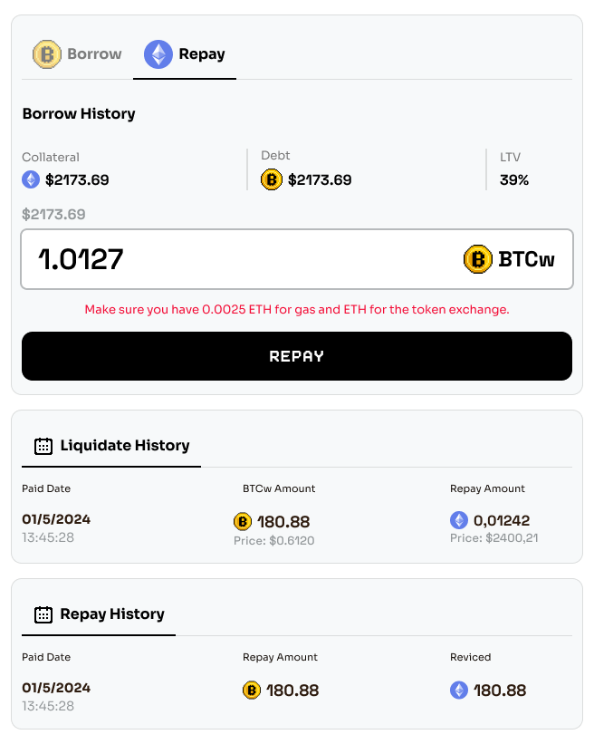 ### **4. Repayment with BTCw Tokens:**