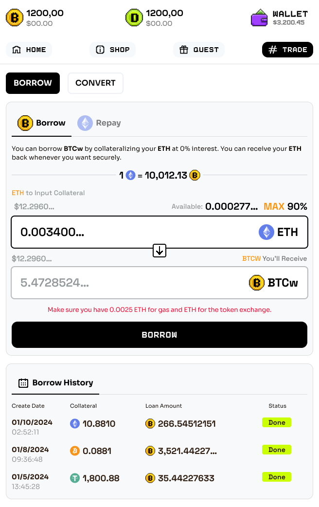The borrow feature offers a unique opportunity for users to leverage their **BTC, ETH...** holdings as collateral to obtain BTCw tokens.