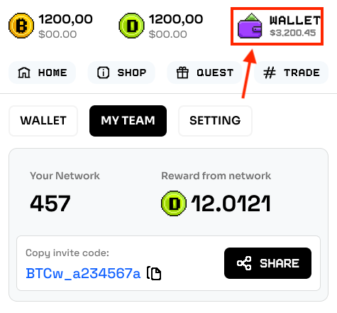 Your total rewards from [**Referrals**](https://docs.btcw.tech/economic/benefits-of-sharing)**,** your invitations, etc. can be found in **"My Wallet"**, section **"My Team**"