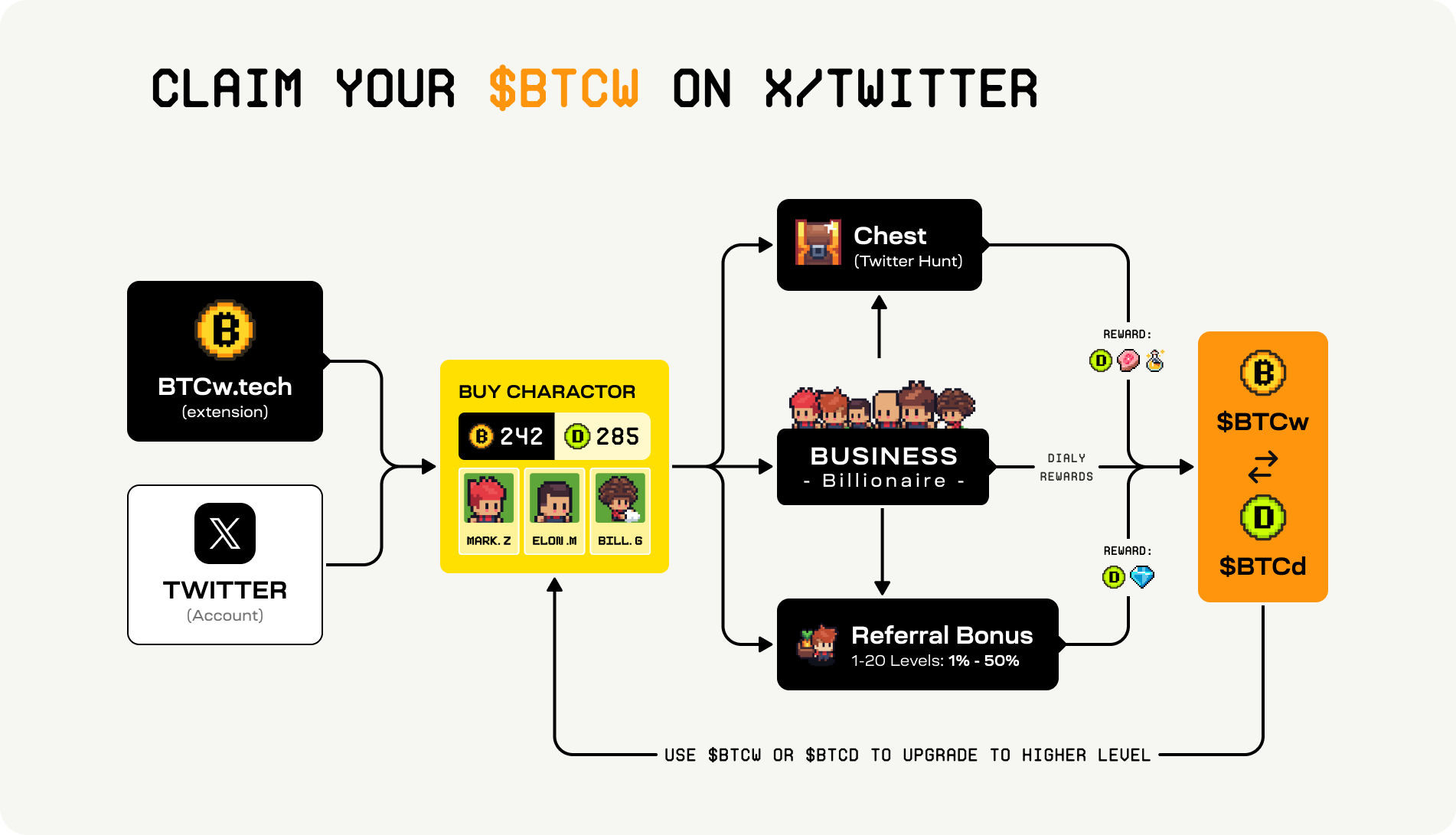 Once claimed, a cycle ends and you receive an amount of [$BTCd](https://docs.btcw.tech/project-info/tokenomic) equivalent to the amount you initially invested to upgrade your Business Man character, and your Business Man character is now at a higher level. If you continue to use the [$BTCd](https://docs.btcw.tech/project-info/tokenomic) just mentioned to further upgrade your Business Man character, you will start a new cycle.